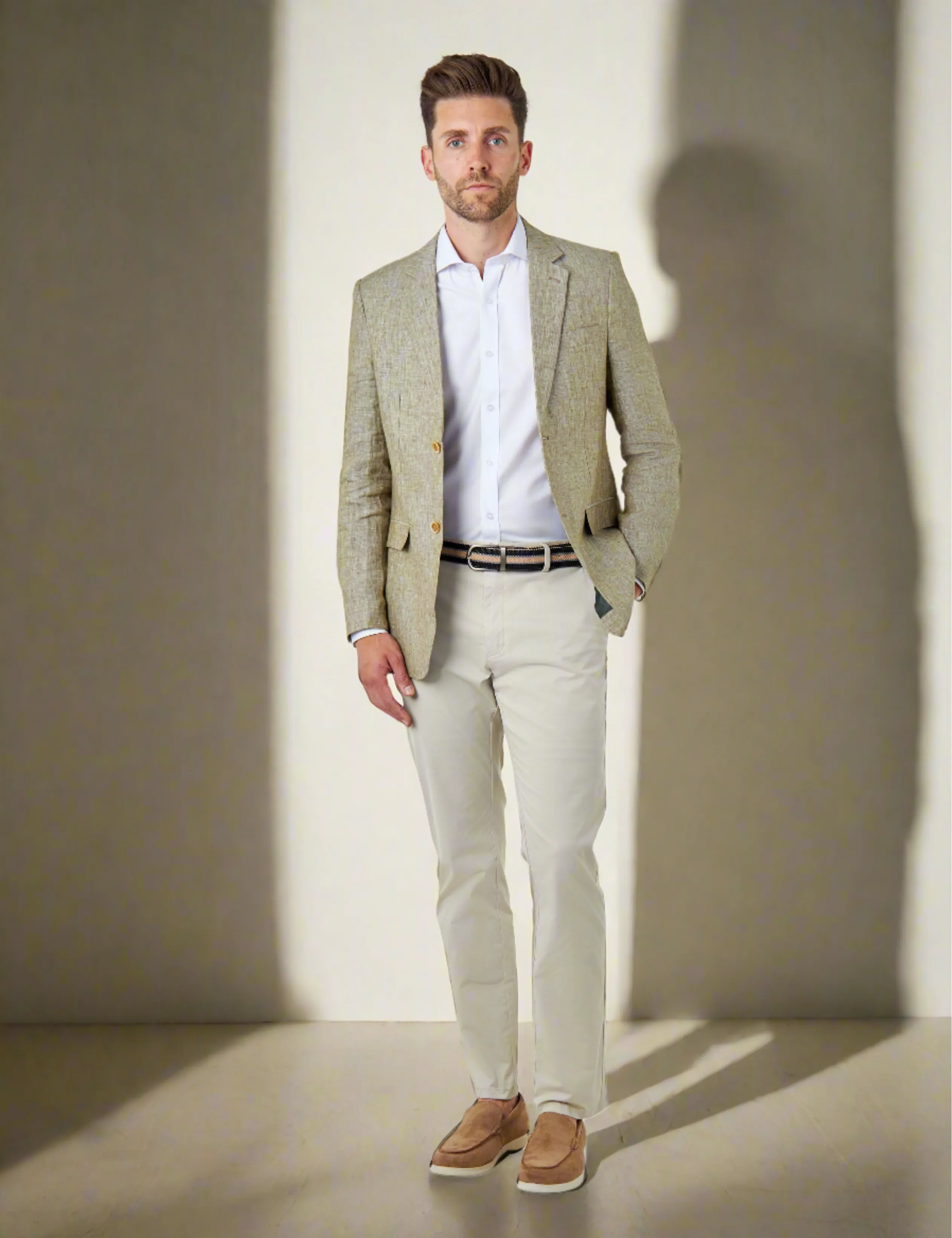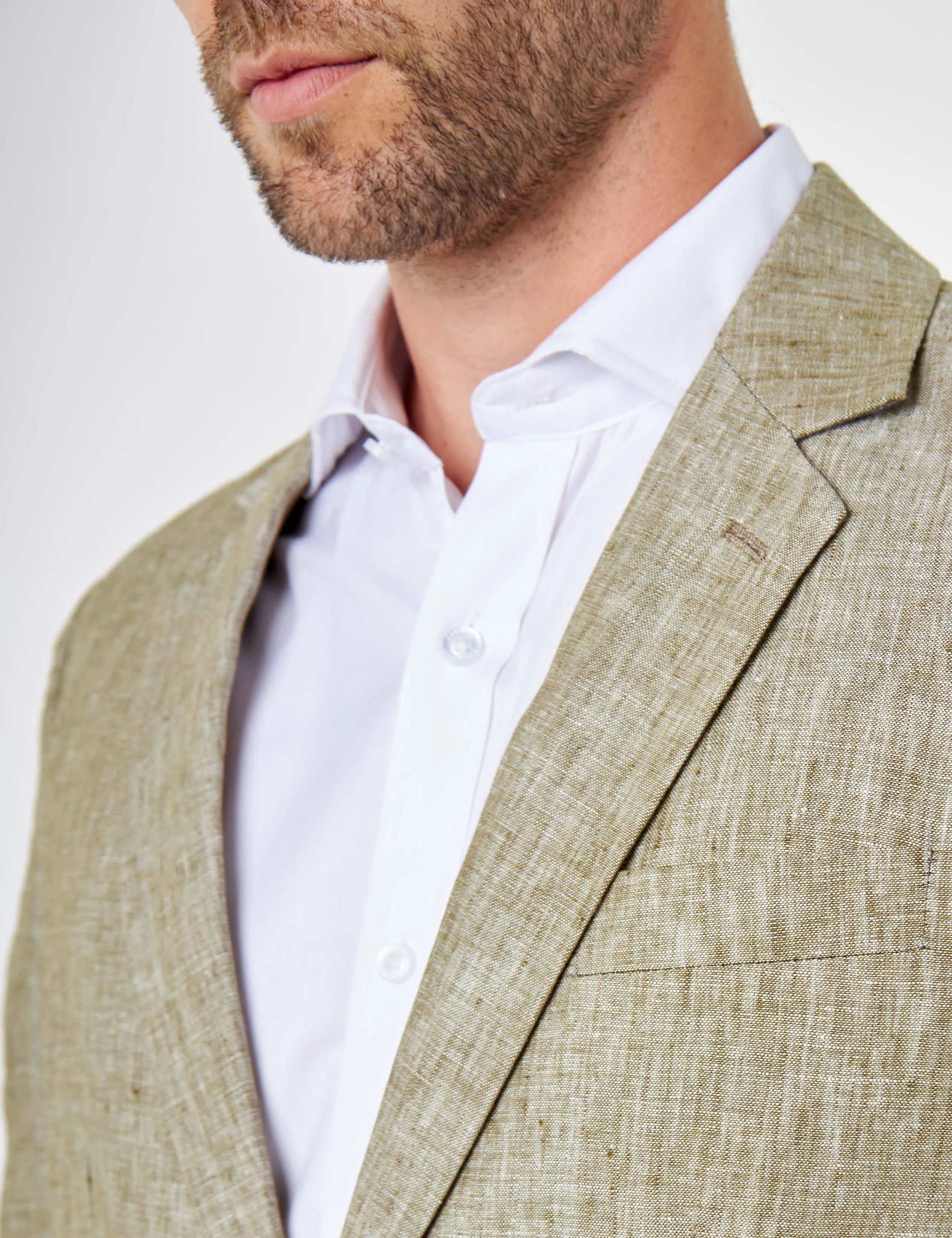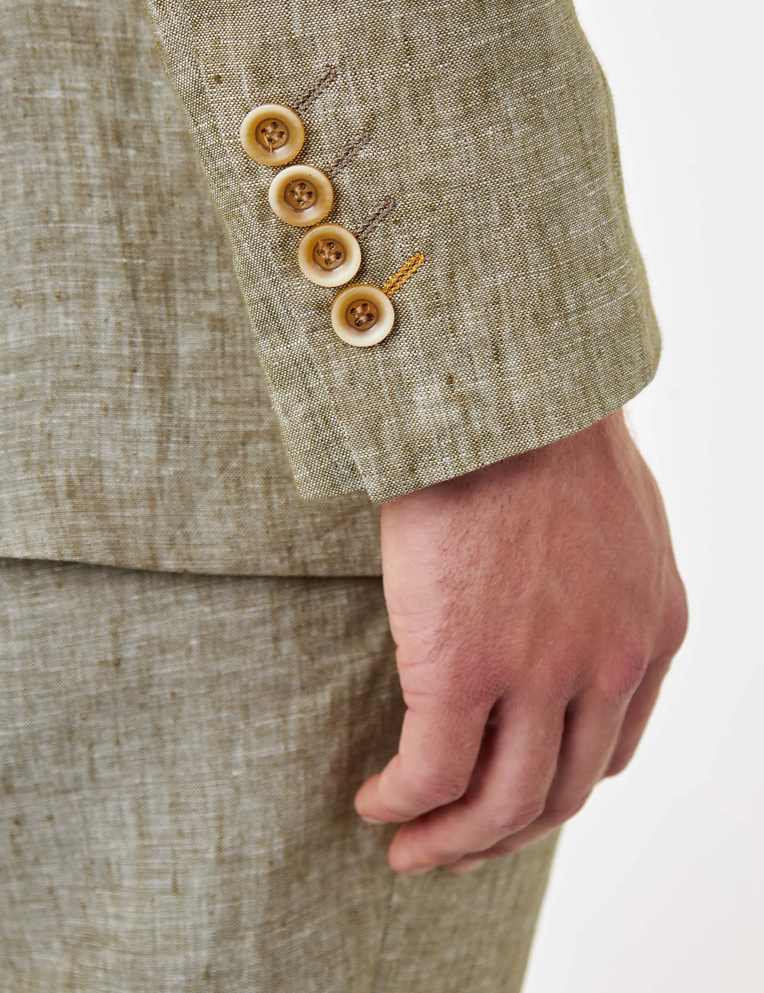 Stay cool and stylish in our Lewis sage green suit blazer. Made with natural spun cotton linen fabric, it features a breathable and sweat-wicking blend for comfort at summer events. The tailored fit strikes a perfect balance between regular and slim, making it versatile for formal or casual occasions.