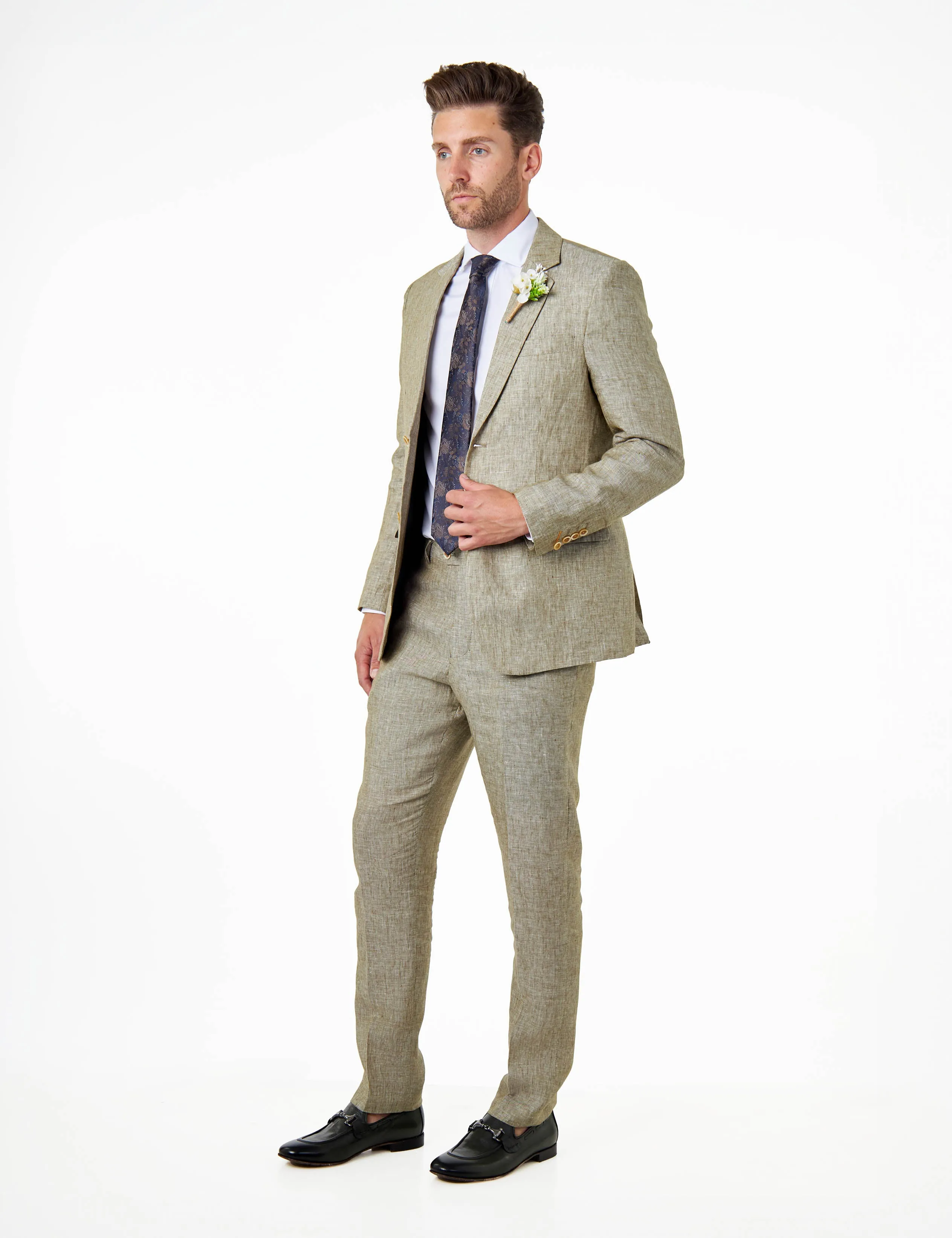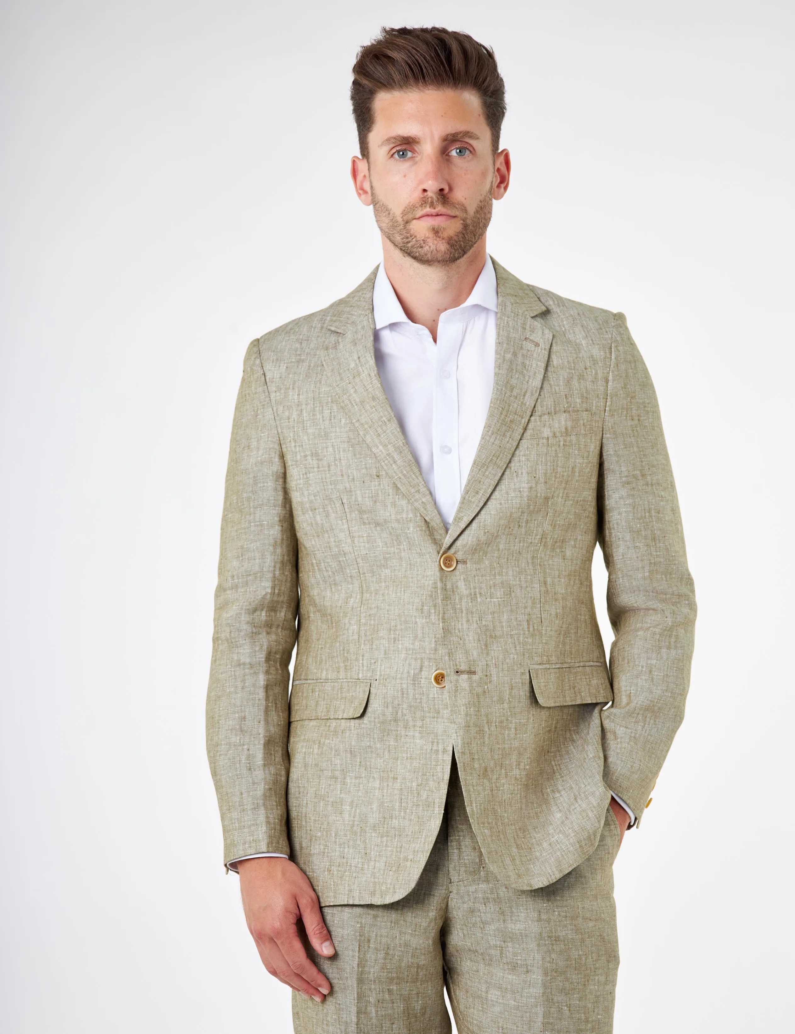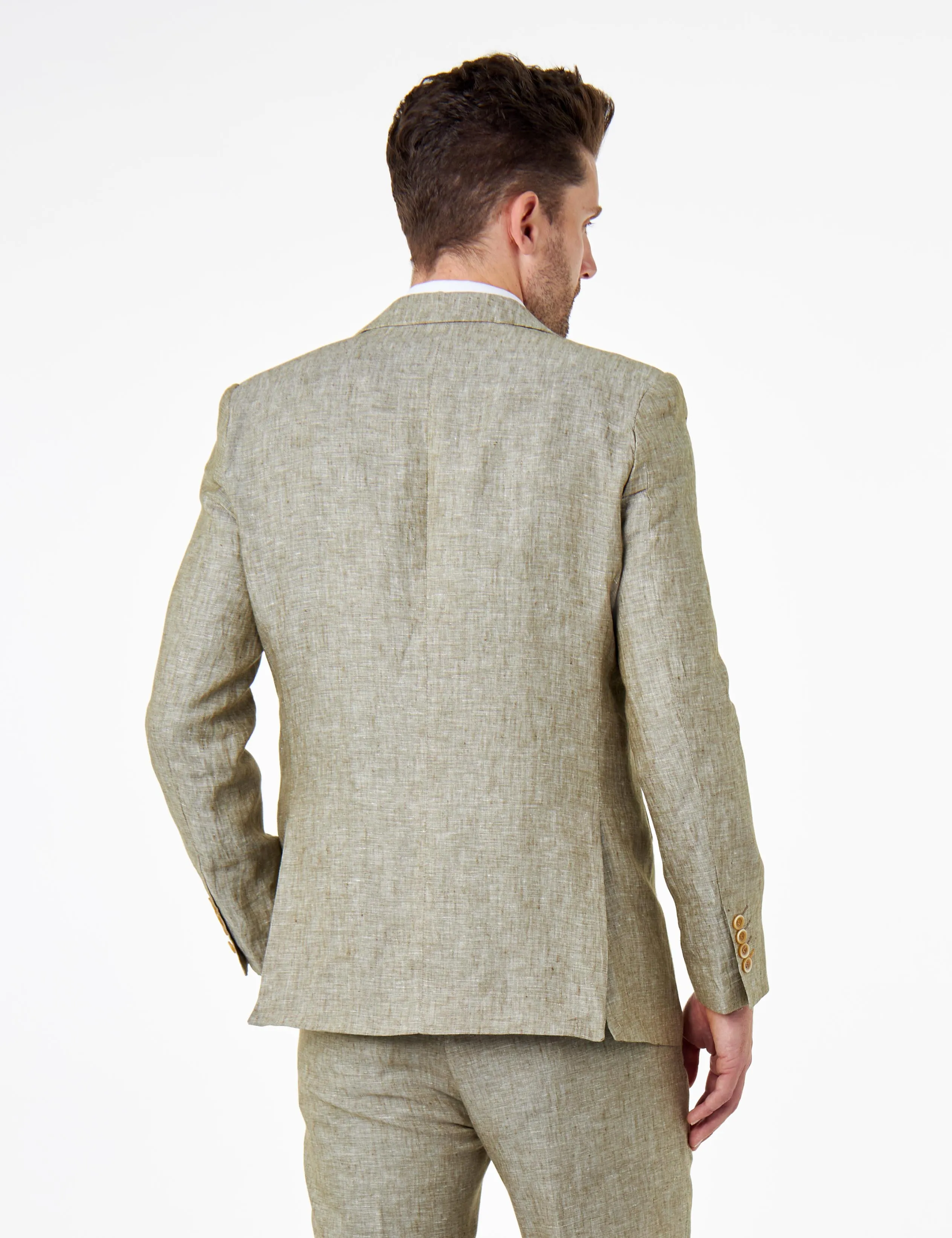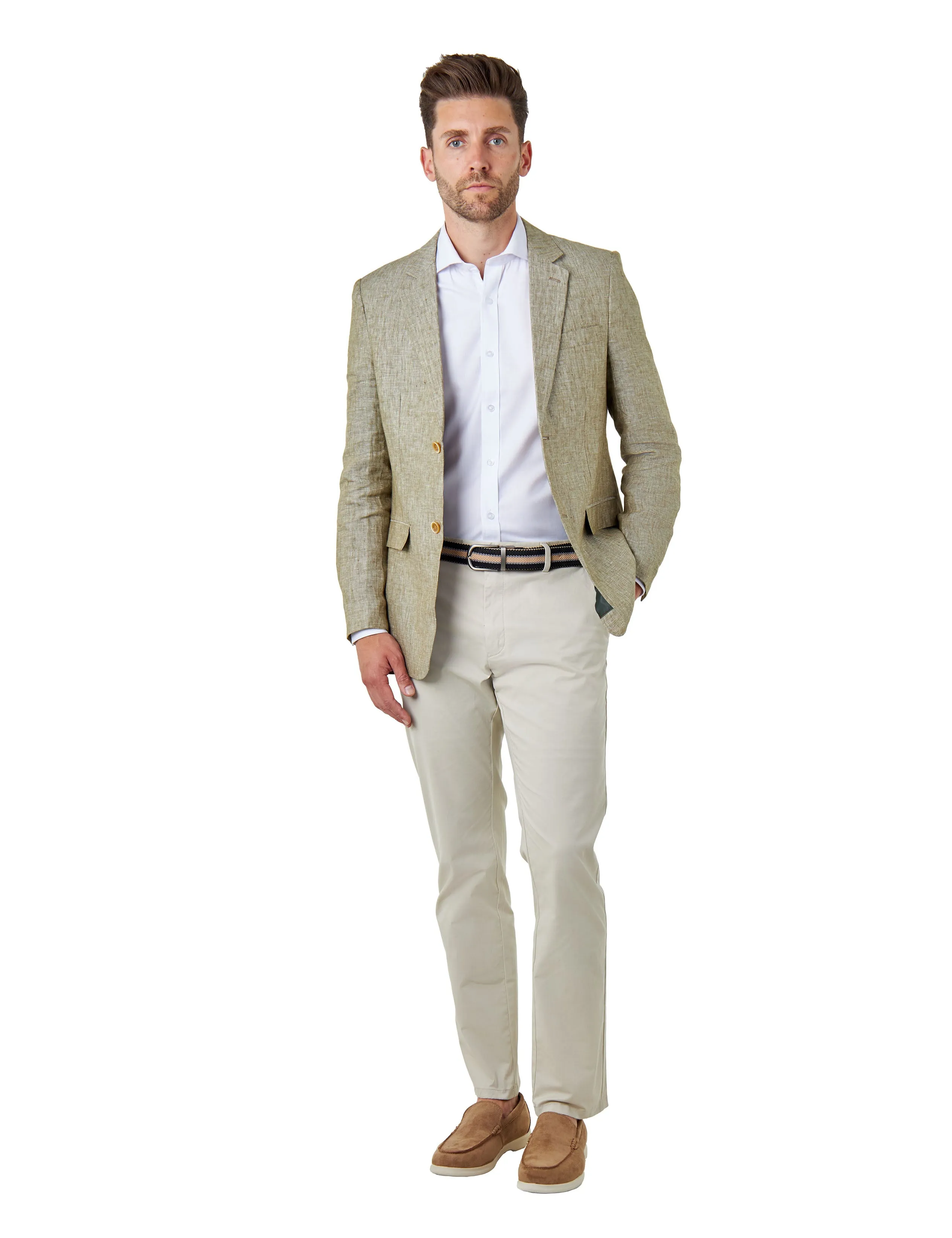 Stay cool and stylish in our Lewis sage green suit blazer. Made with natural spun cotton linen fabric, it features a breathable and sweat-wicking blend for comfort at summer events. The tailored fit strikes a perfect balance between regular and slim, making it versatile for formal or casual occasions.